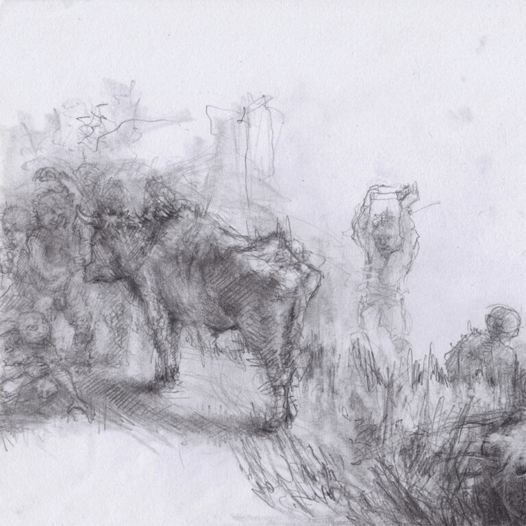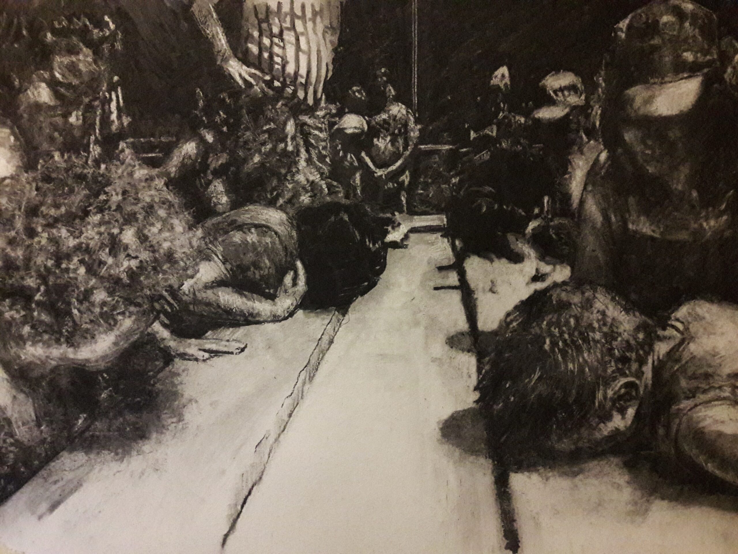 “Strive for Achievements” is the working title for a series of charcoal drawings. This series centers on the “allure” of our culture, focusing on achievements such as festivals, museums, indoor party games, technology, corporate gatherings, healthcare, and community gardens. While we eagerly cling to the comforts gained in the past, we remain devoted to pursuing promises that lie in the future.