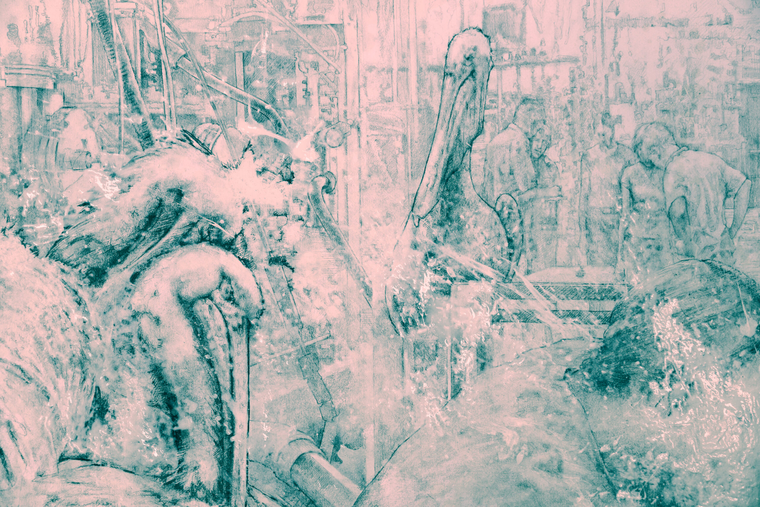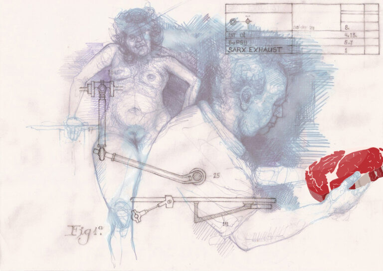 In his drawings, Wieman employs “sampling.” He extracts fragments of existing, sometimes recognizable images from their original context and combines them into new compositions. This creates new relationships between the images, resulting in a more ambiguous meaning. By tapping into our natural desire for a coherent narrative, he aims to draw the audience toward the work. However, through the intricate details of his execution, he intentionally leaves meaning open to interpretation.